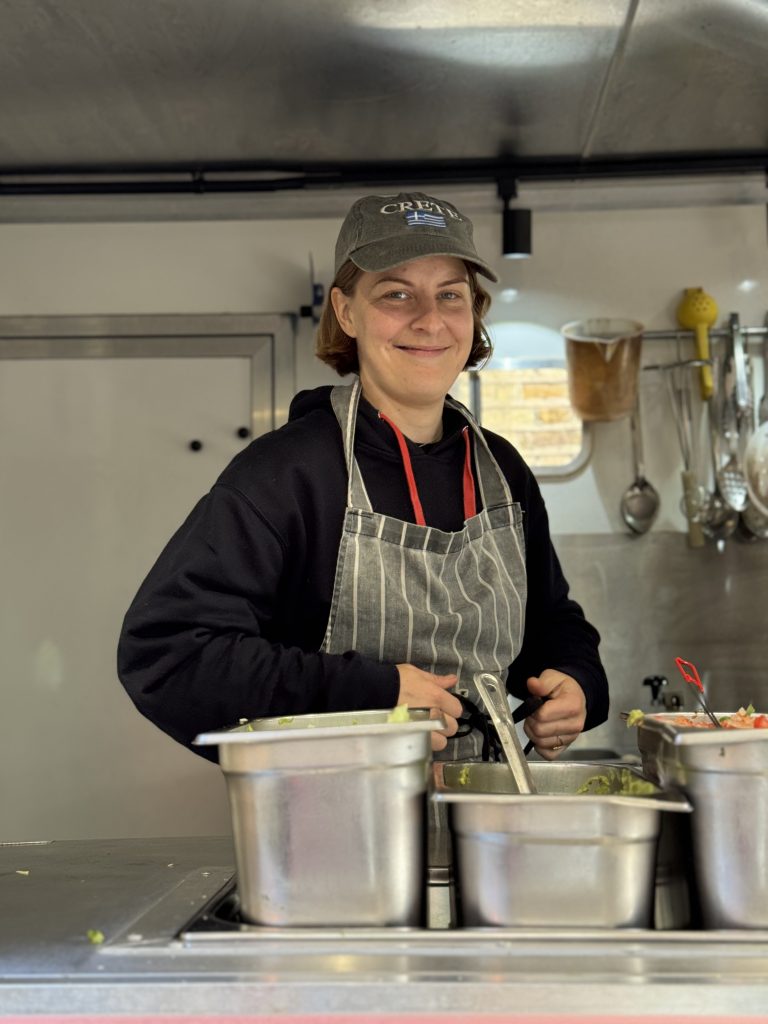I meet Harriet of XX burritos, round the back of their distinctive VW foot truck adorned with millennial pink graffiti. In casual clothes and a Crete cap, espousing brand loyalty with guacamole and nachos. She’s been here since 7, cycling over from Camberwell after a 5am alarm. Unlike many stalls, the van doesn’t need assembling, so her first job of the day is simply to plug the van into a generator, and grab coffees for the three person team.