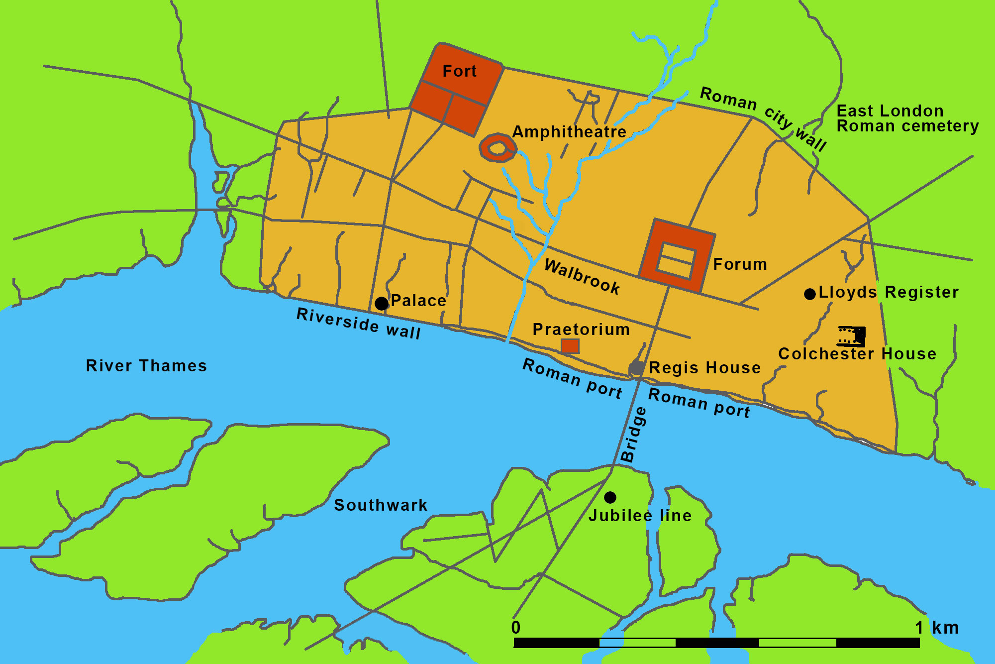 Archaeologists have found a substantial piece of the ancient city’s first basilica – a 2,000 year old public building where major political, economic and administrative decisions were made. The Basilica was attached to the north wall of the Forum Building shown on the map of Roman London above, provided by the London Museum.