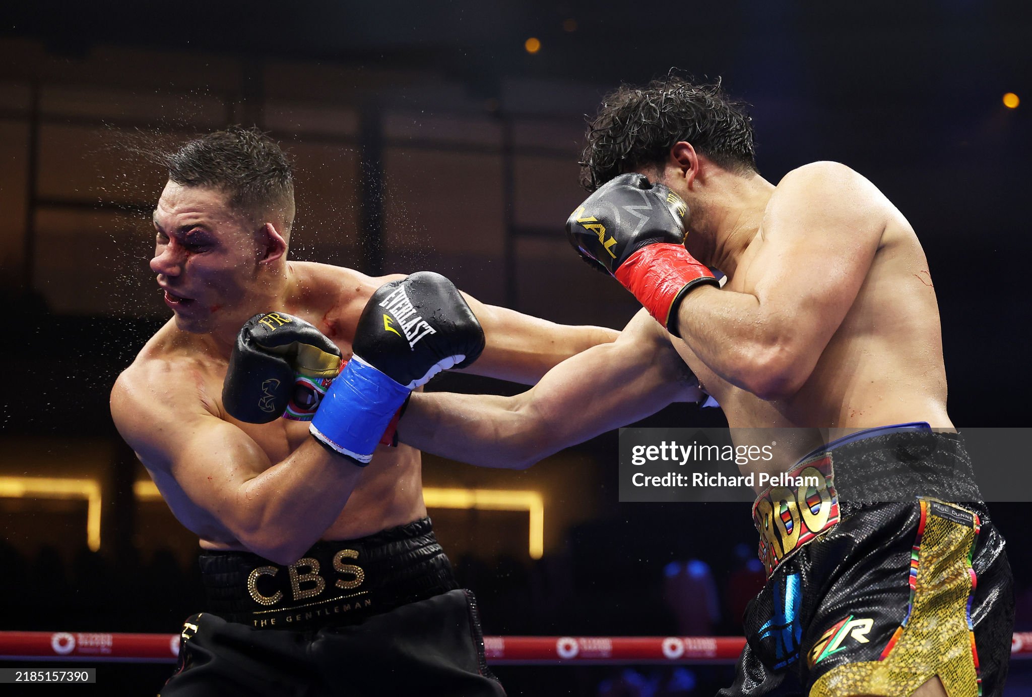 RIYADH, SAUDI ARABIA - NOVEMBER 16: Gilberto Ramirez punches Chris Billam-Smith during their WBO World Cruiserweight title fight on the Riyadh Season Latino Night at Kingdom Arena on November 16, 2024 in Riyadh, Saudi Arabia. (Photo by Richard Pelham/Getty Images)