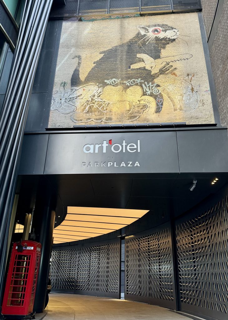 Towering behind him, the luxury Art’otel charges up to £1000 per night for a room. It features Banksy murals that once protested the inequality that Mark now represents.